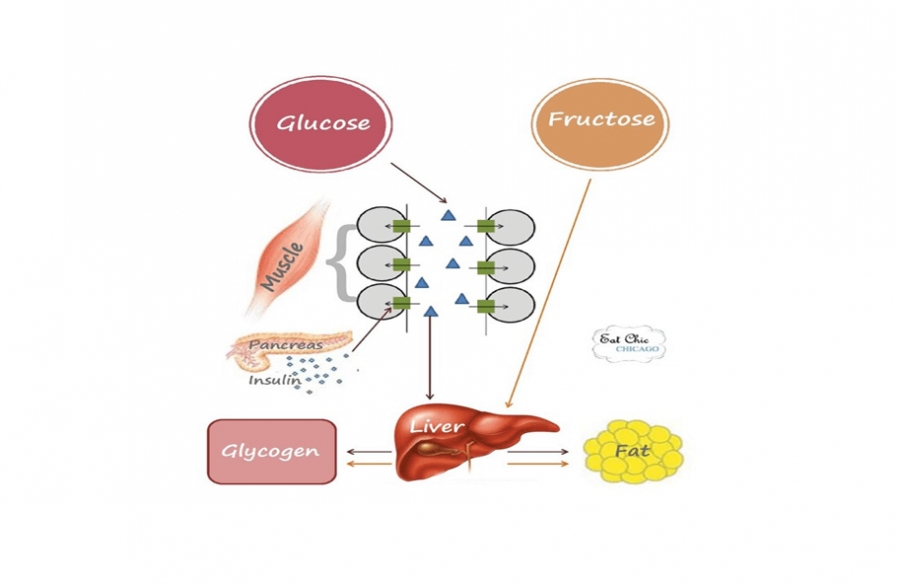Fruktozę metabolizuoja tik kepenys, kitos organizmo ląstelės metabolizuoti fruktozės negali. Kepenyse fruktozė verčiama į gliukozę, glikogeną, laktatą ir trigliceridus. Tačiau, kai kepenys sukaupia pakankamai glikogeno, o šiuolaikinis žmogus glikogeno atsargų kepenyse turi pakankamai, su maistu patekusi fruktozė verčiama į riebalus ir keliauja tiesiai į riebalų depo todėl, kad raumenys ir kitos organizmo ląstelės negali jos sunaudoti.